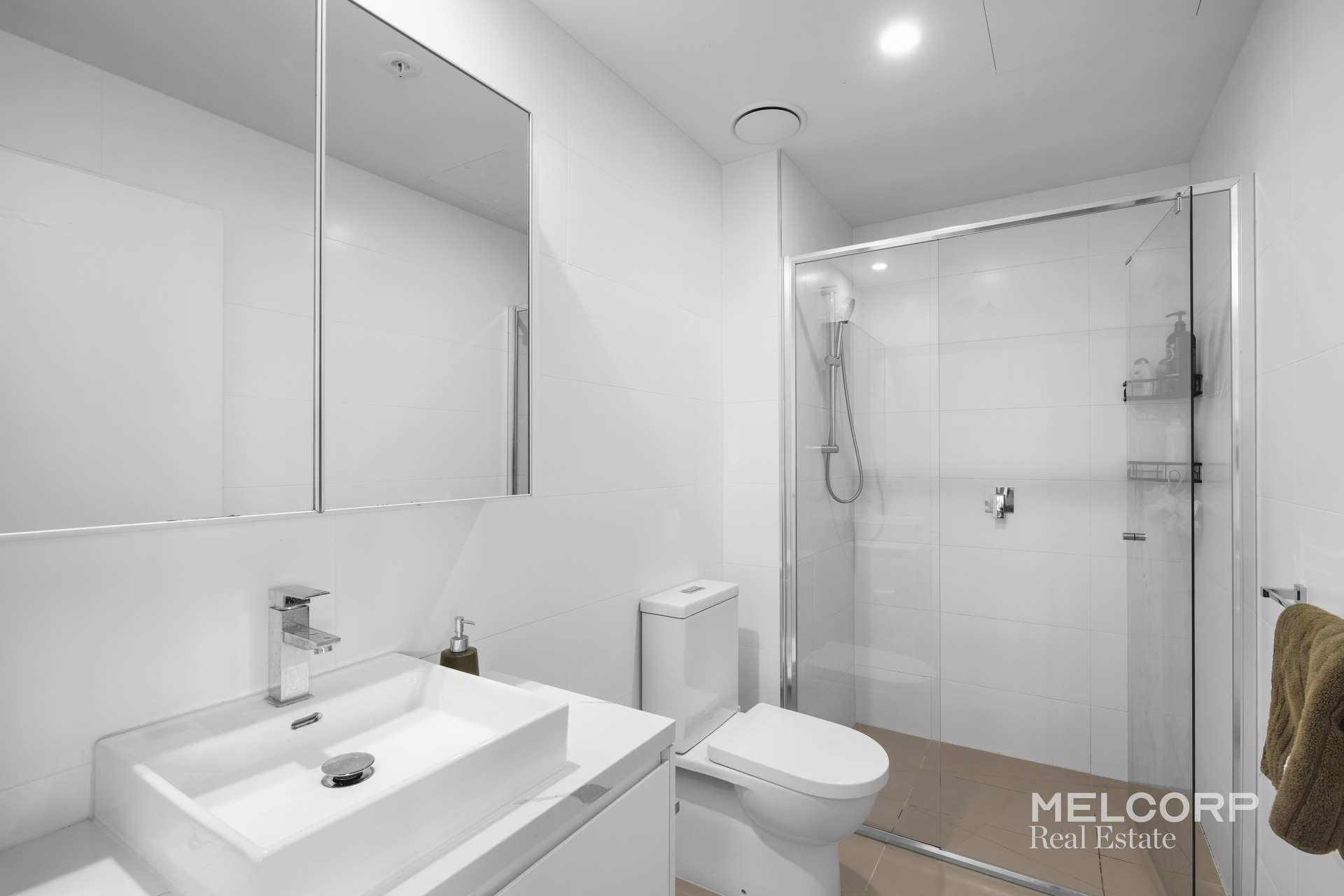 The bedroom is fitted with built-in robes, and the private balcony offers an inviting space to relax and take in the leafy outlook. Throughout the apartment, stone benchtops, stainless steel appliances, and sleek contemporary fixtures combine to create an atmosphere of modern sophistication.