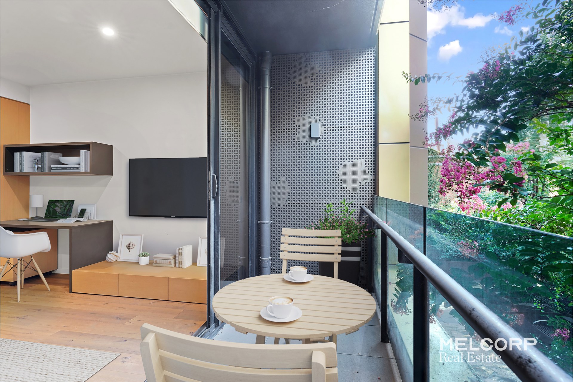 Blessed with a desirable floor plan with a highly efficient use of space and cross flow ventilation highlighted by an expansive light-filled living and dining area, this gem is further enhanced by floor-to-ceiling windows extending out to a captivating terrace overlooking a beautiful and tranquil courtyard. Stunning timber floorboards extend throughout the living, dining and hallway, while the gourmet kitchen which enjoys excellent storage from the premium timber veneer cabinets, mirrored splashbacks, Caesarstone benchtops, trendy Grohe black chrome tapware and quality stainless steel Bosch appliances.
