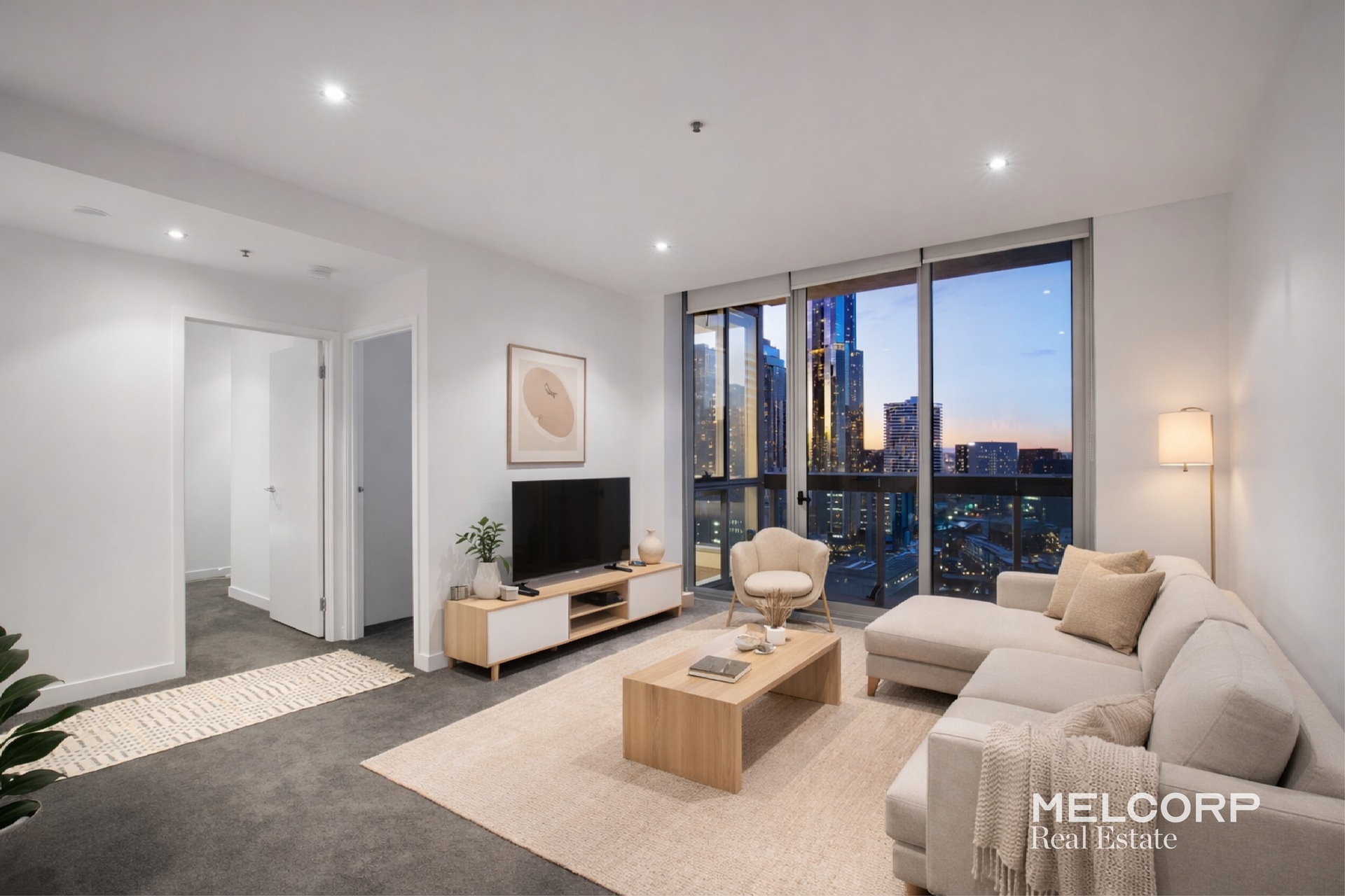 Enjoying a prized northerly aspect, the home is bathed in natural light and captures sweeping city views from every angle. A well-considered floor plan showcases a modern stone-bench kitchen with quality stainless steel appliances, flowing seamlessly into the open-plan living and dining domain, and out to a private entertainer’s balcony — perfect for taking in Melbourne’s iconic skyline.