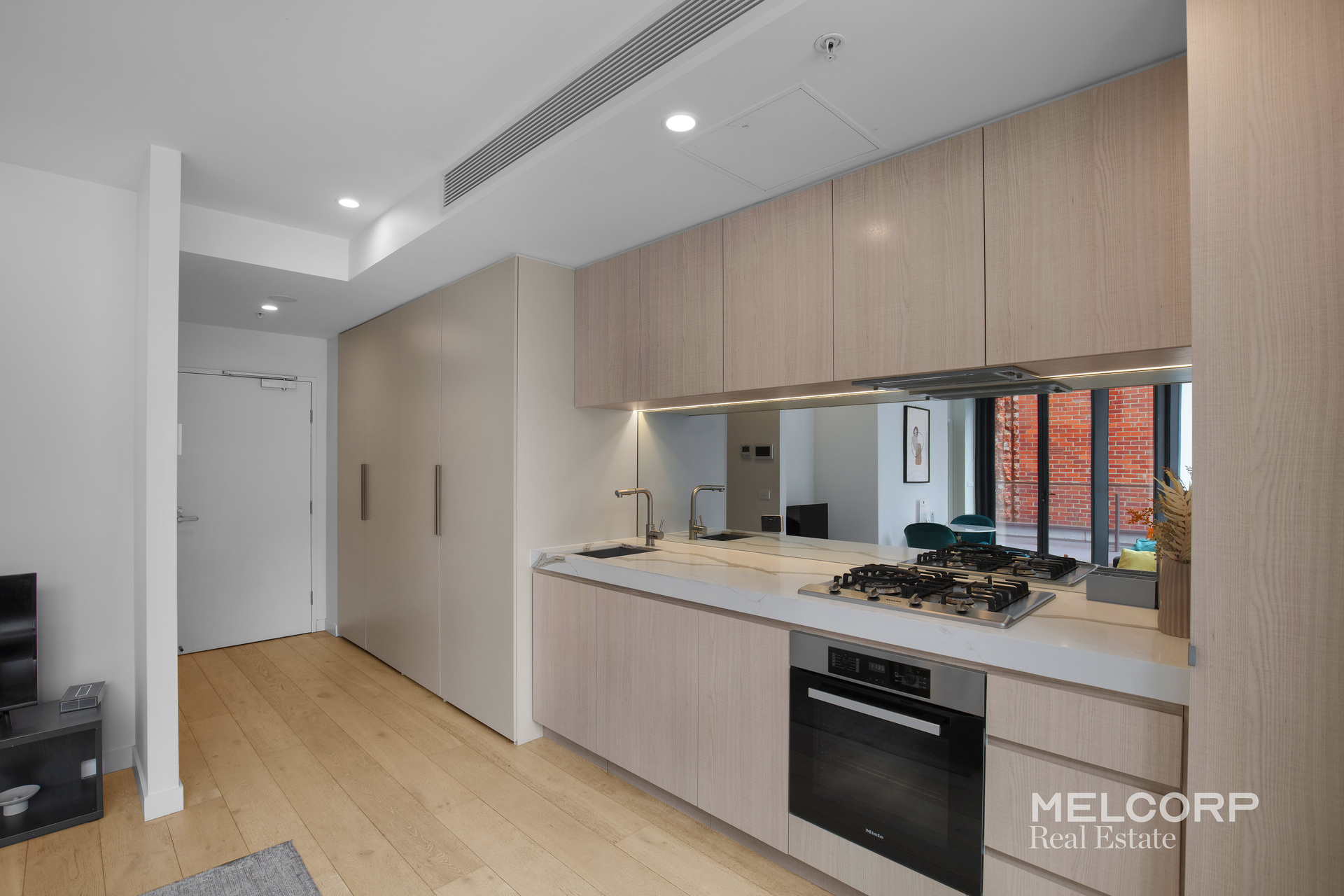 Set between Melbourne’s CBD and the waterfront, this Melbourne Village apartment enjoys city views and a thoughtfully designed layout. Floor-to-ceiling windows invite abundant natural light, complementing the timber floors in the open-plan living and dining area. A private balcony extends the living space, while the kitchen features stone benchtops, a mirrored splashback, and ample storage and European laundry add everyday convenience.
