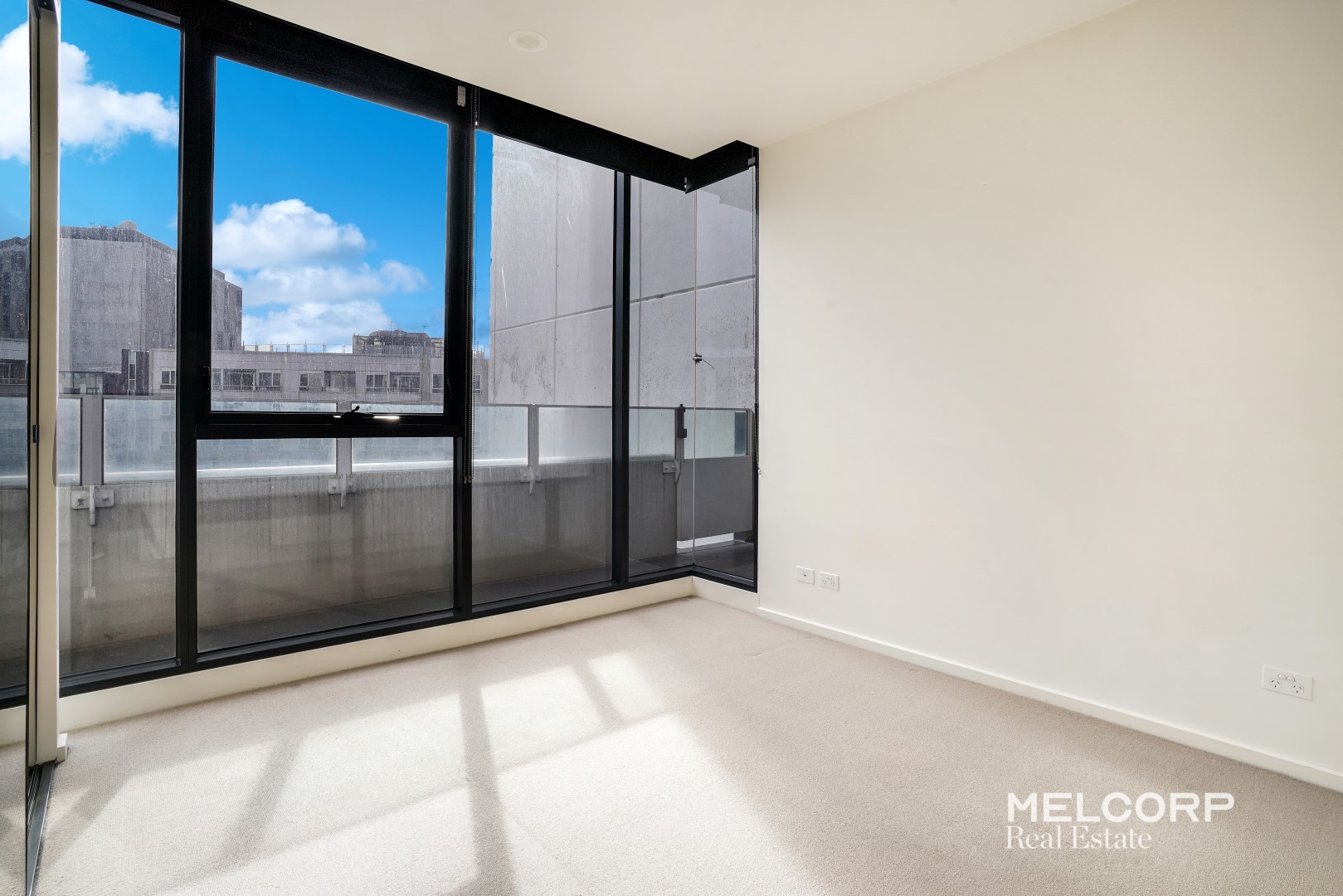 Elegantly finished, the apartment offers an open living and dining area that flows seamlessly into a modern kitchen, complete with a glass splashback, stone countertops, European appliances, and in-unit laundry facilities.