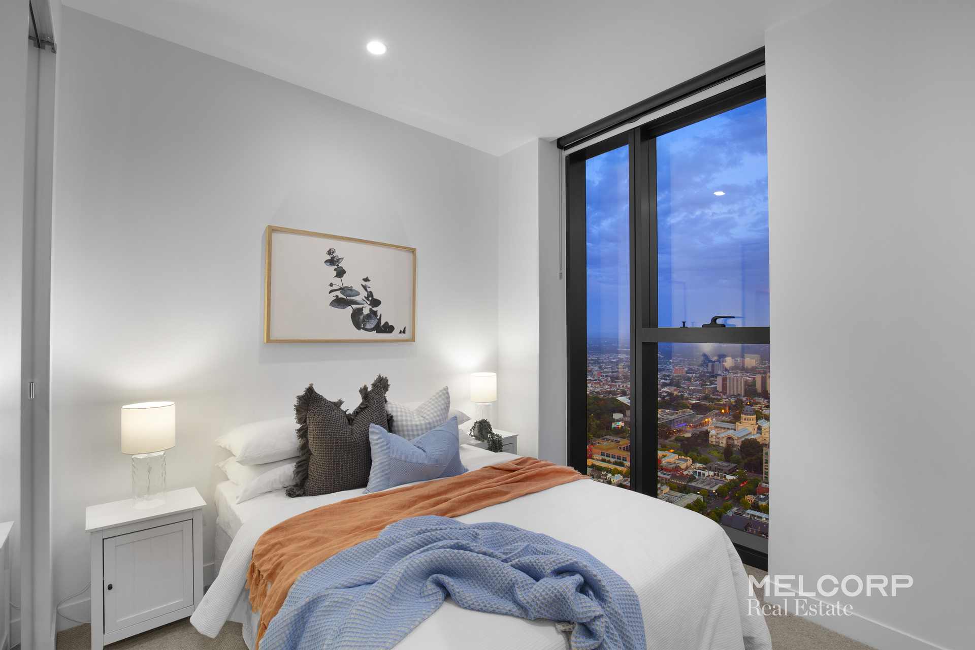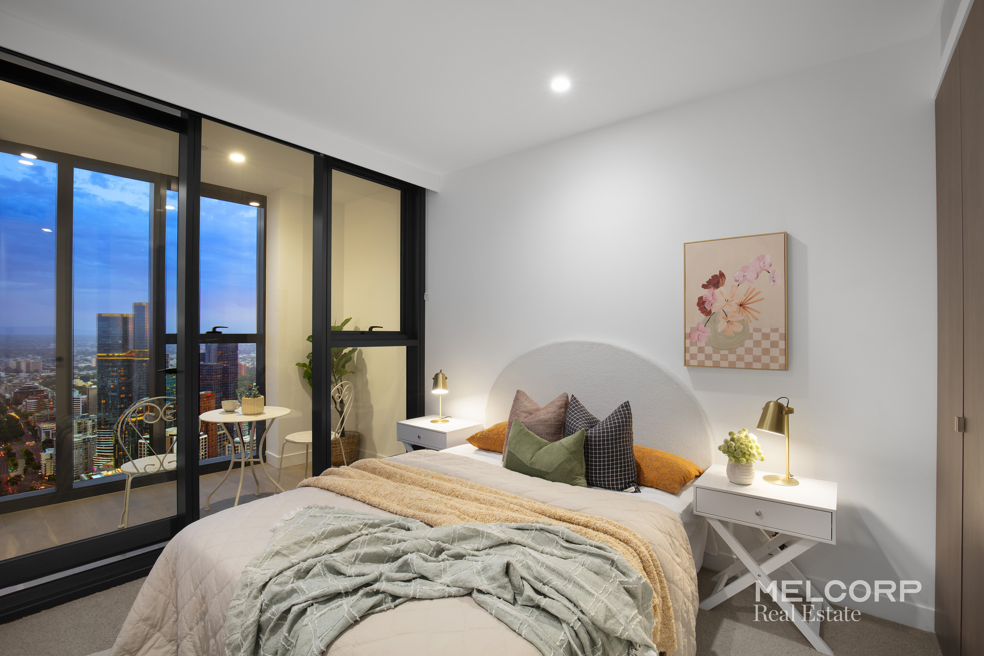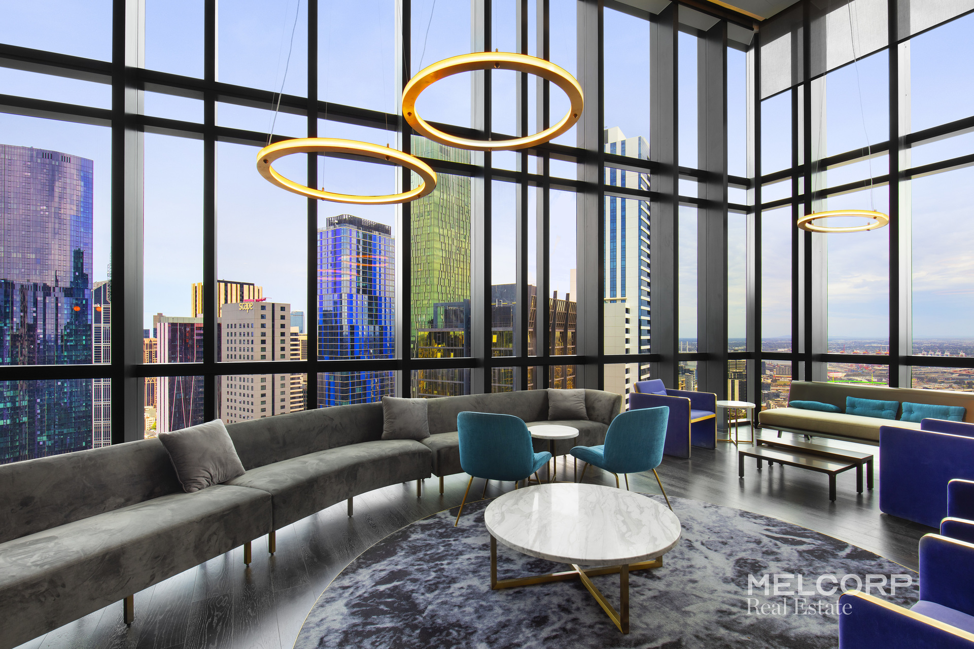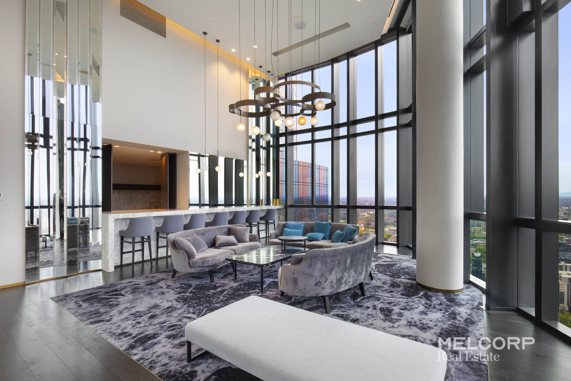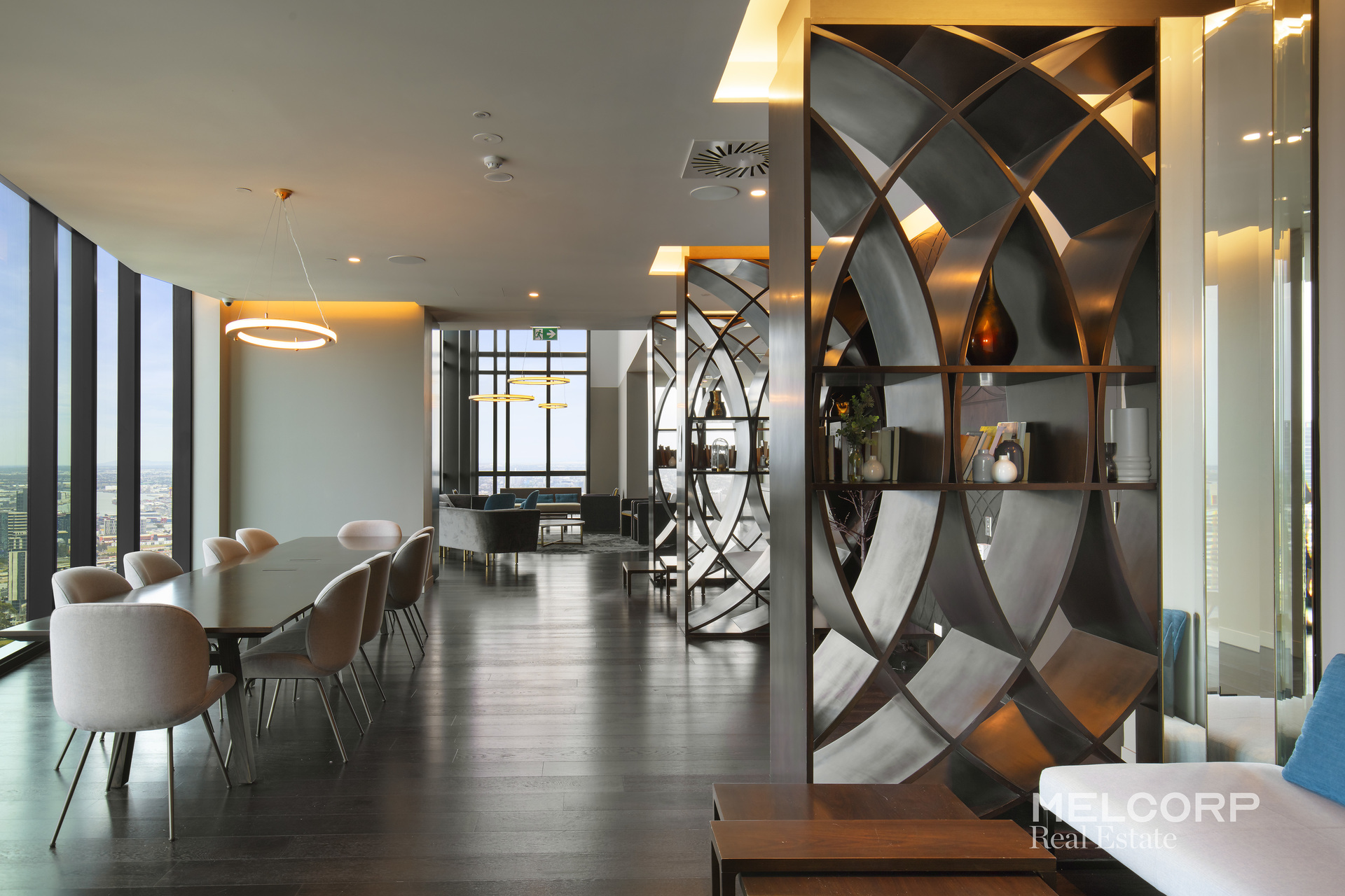 Bathed in beautiful morning sunlight, the living and dining area is enhanced by floor-to-ceiling windows and timber flooring, creating a warm and contemporary atmosphere. The modern kitchen is superbly appointed and features a convenient breakfast bench, while seamless access leads to the enclosed winter-garden balcony, allowing year-round enjoyment and uninterrupted views from the impressive Level 61 vantage point.