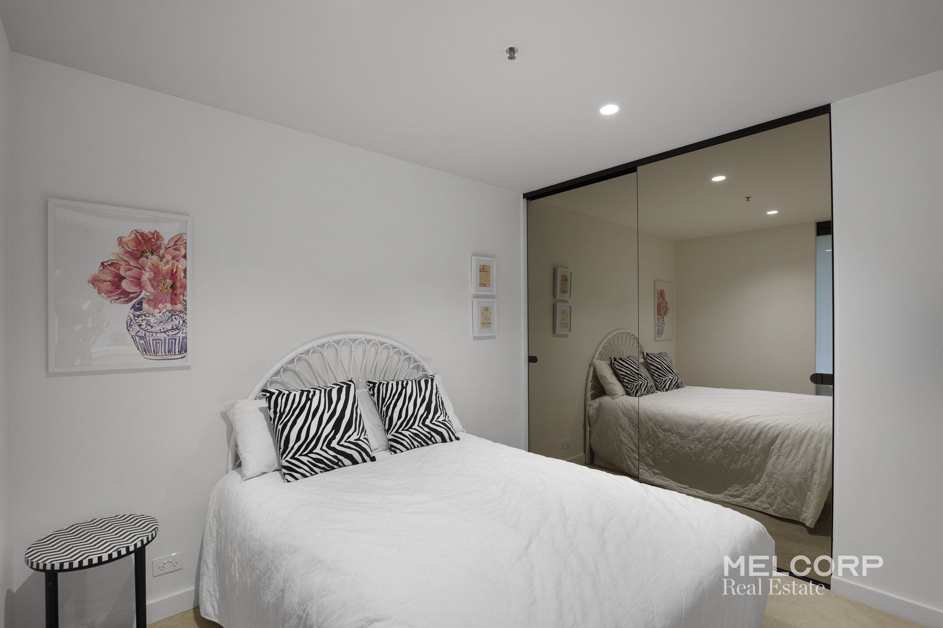 Positioned on the ninth floor of the sought-after Peak complex, the apartment enjoys a desirable north-facing orientation. Spacious open-plan living and dining is complemented by a stone-appointed kitchen featuring premium Bosch appliances, including a gas cooktop. Floor-to-ceiling glass extends the living area onto a covered balcony that captures the warmth of morning sun while framing skyline views stretching towards the treetops of Carlton Gardens.