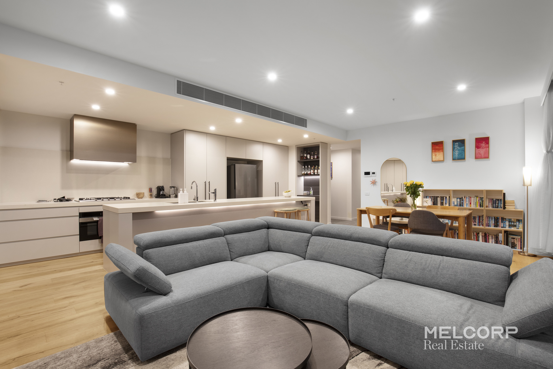A full-length balcony seamlessly connects indoor and outdoor spaces, creating an ideal setting for year-round entertaining. The expansive kitchen is a chef’s dream, featuring an oversized island bench, cleverly designed and ample storage throughout, and generous preparation space. Individually zoned heating and cooling provide tailored comfort in every room, while floor-to-ceiling windows flood the home with natural light and frame uninterrupted views, enhancing its contemporary elegance.
