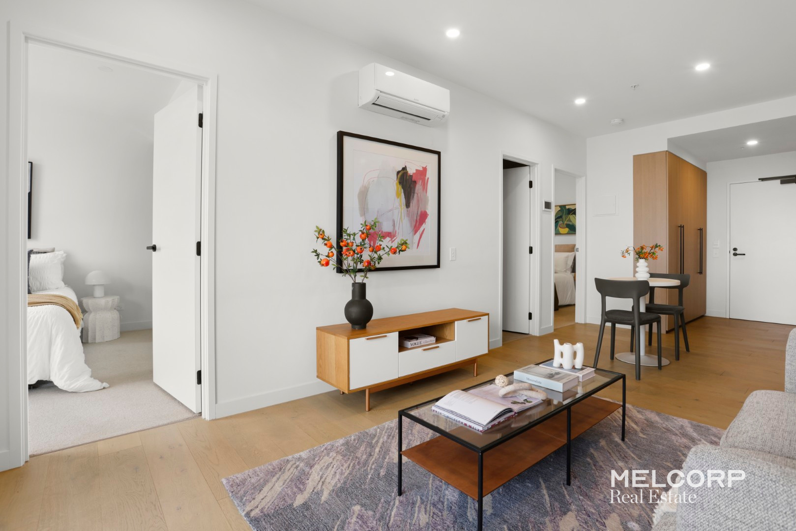 Both bedrooms are well-proportioned and appointed with mirrored built-in robes, while the master enjoys the luxury of a modern ensuite. Additional features include a discreet European laundry, reverse-cycle heating and cooling, elegant floorboards to living areas, plush carpeted bedrooms, secure intercom entry, and a dedicated car space.