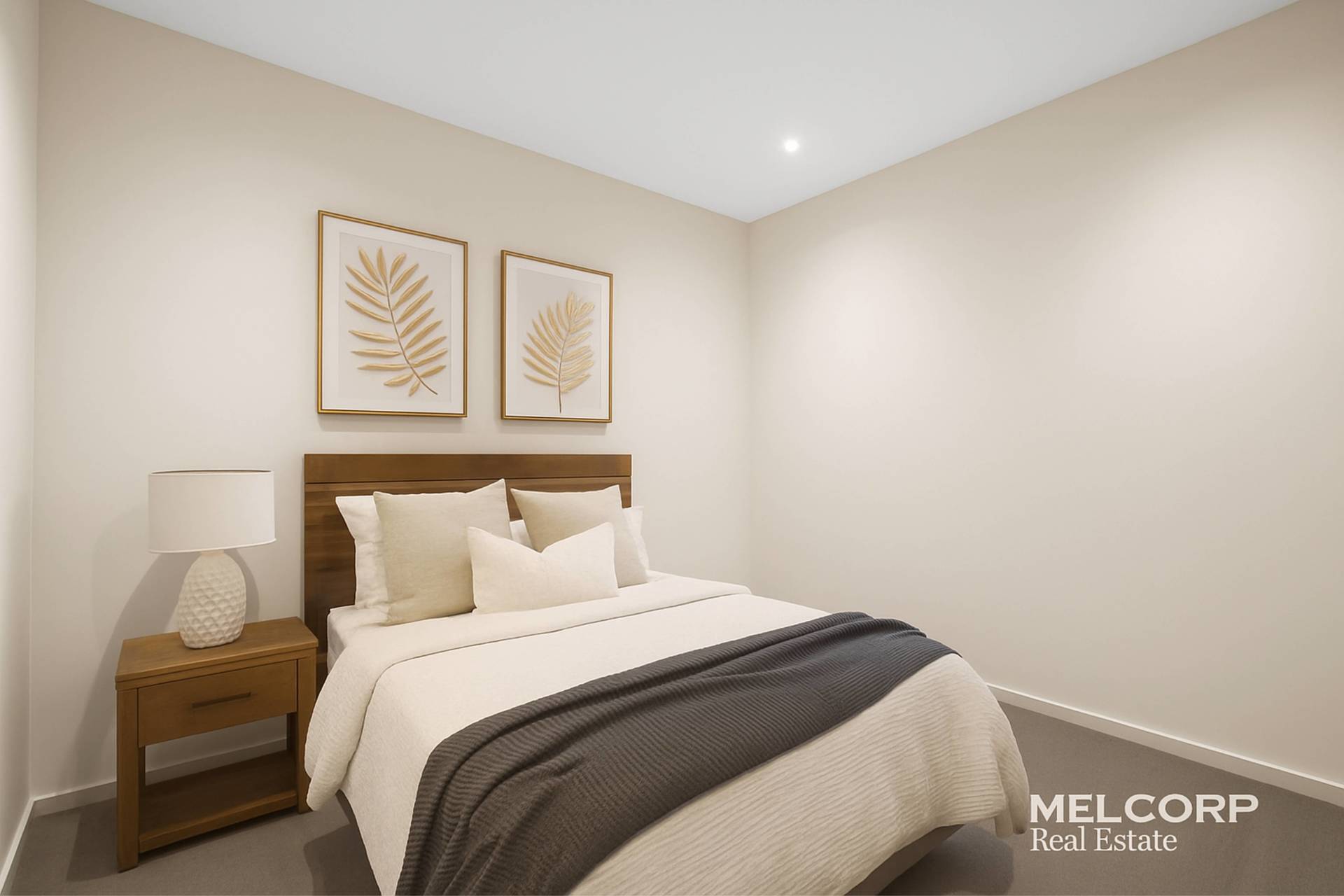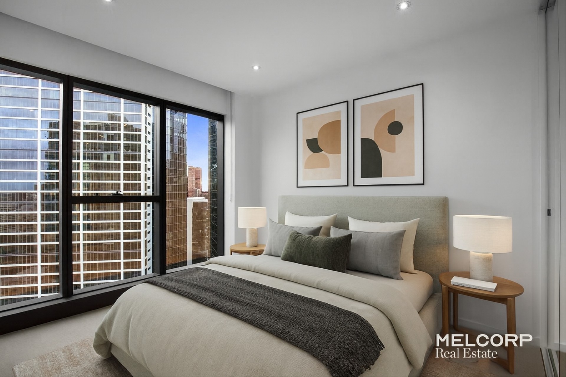 – Main bedroom with built in robes, floor to ceiling exterior windows taking advantage of the wonderful views over Melbourne