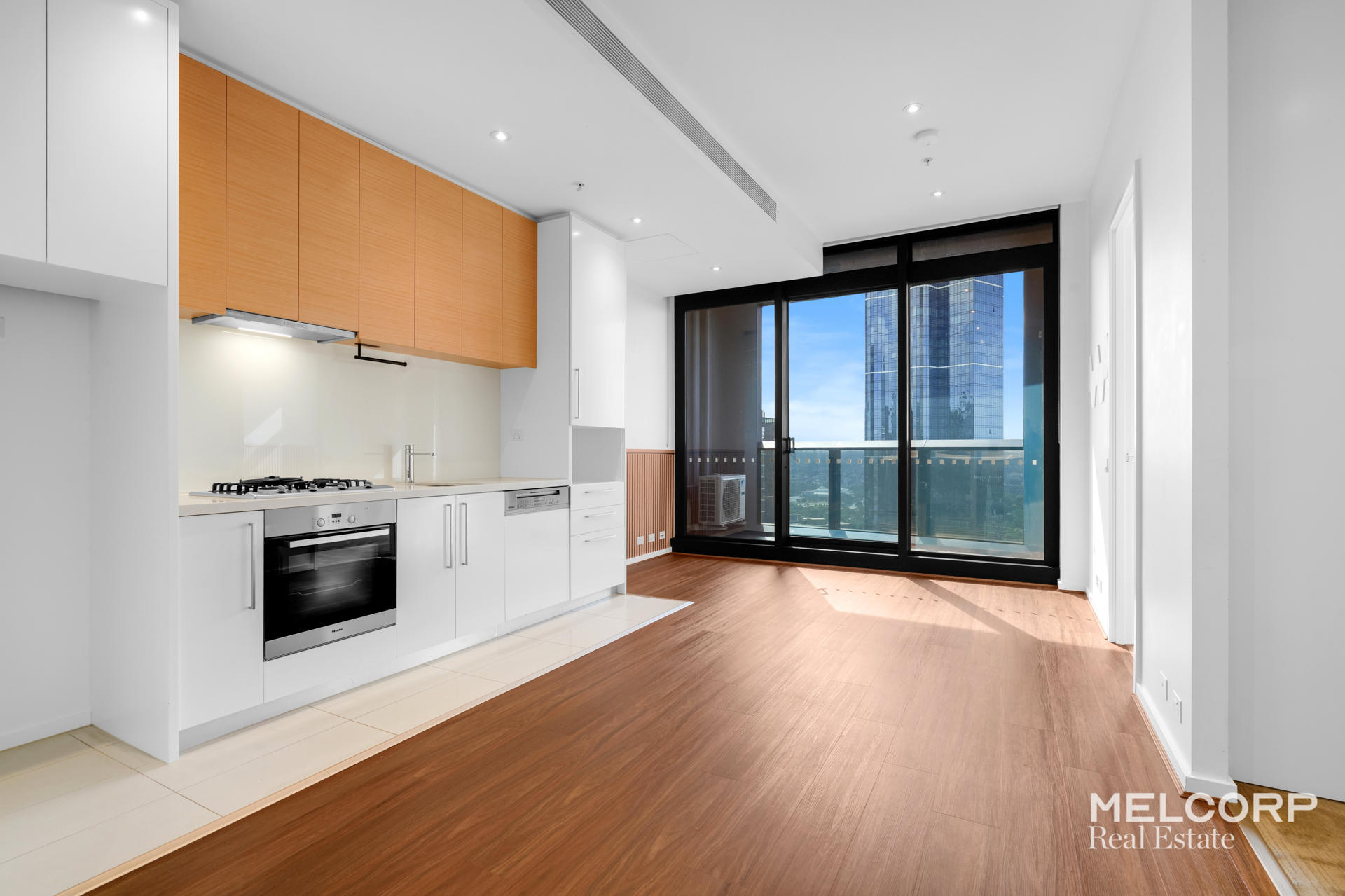– Modern kitchen with Miele appliances, including gas cooktop and dishwasher