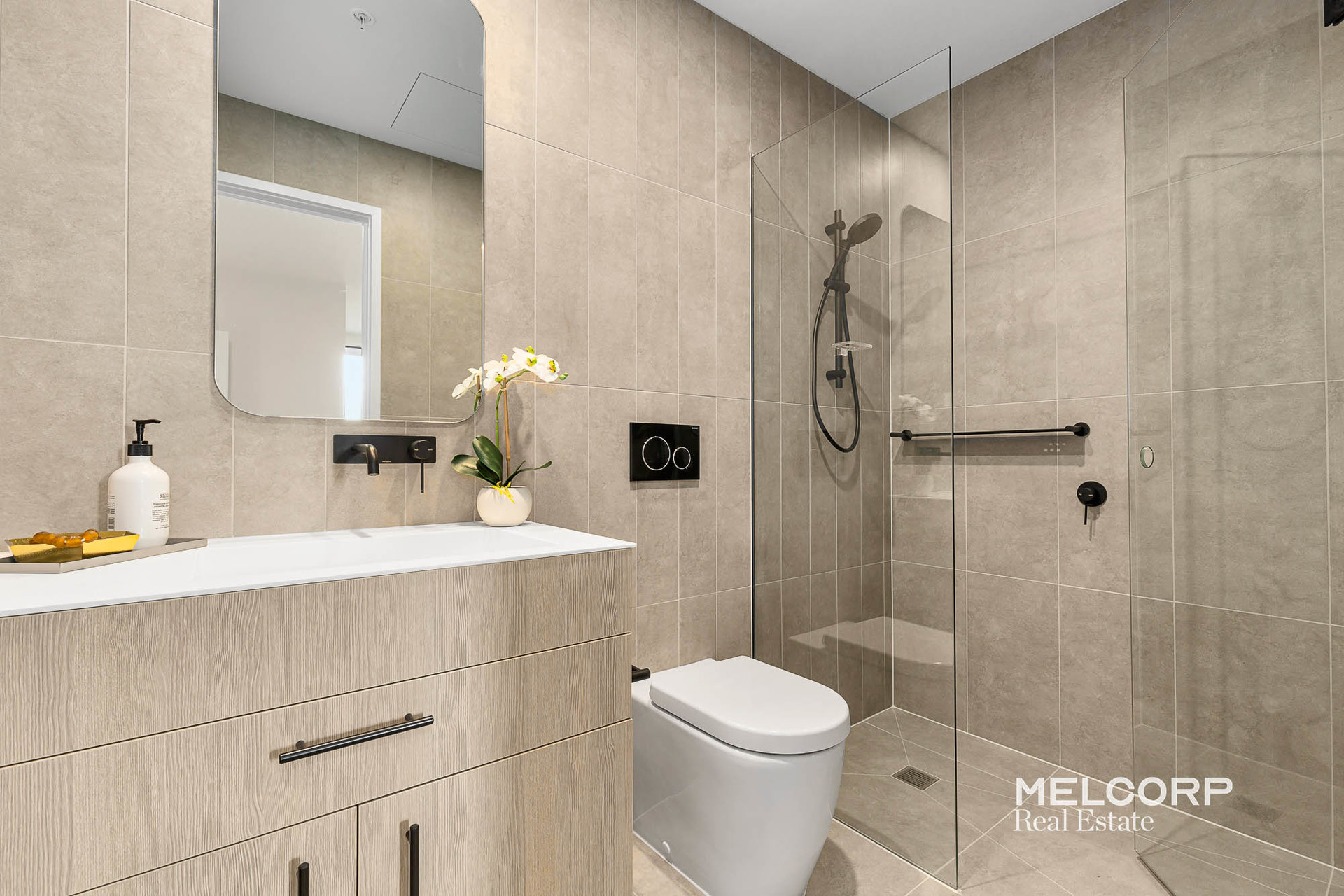 – Luxurious central bathroom with floor-to-ceiling tiles