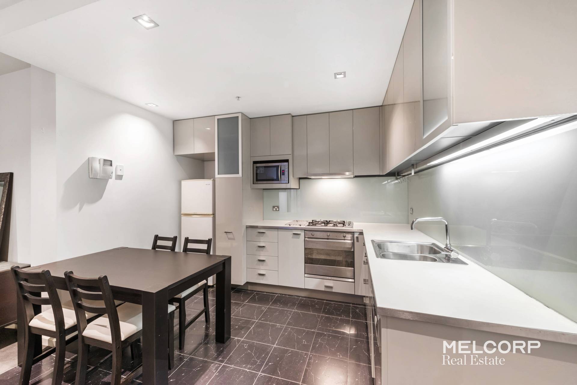 – Modern kitchen including microwave and fridge