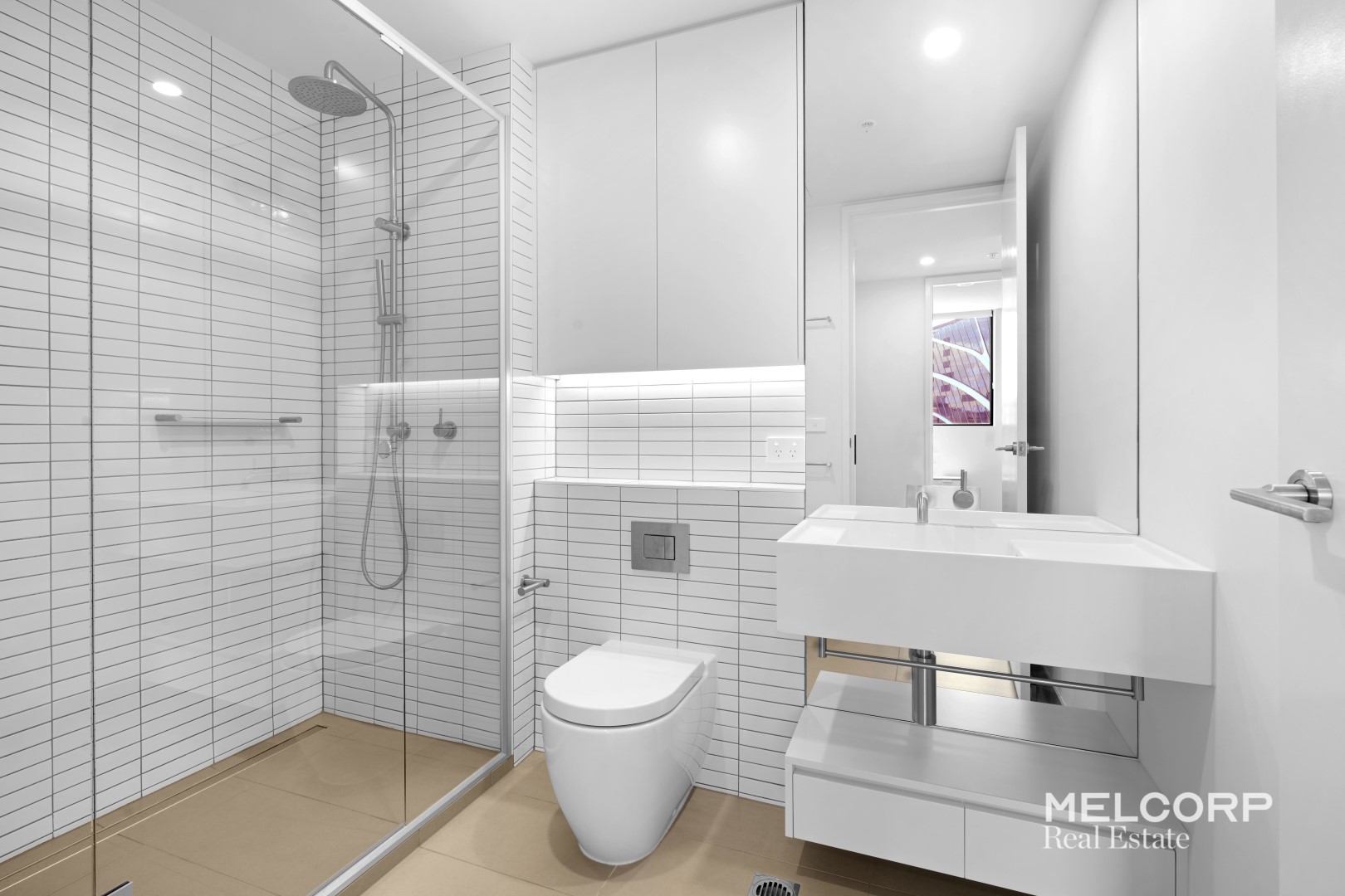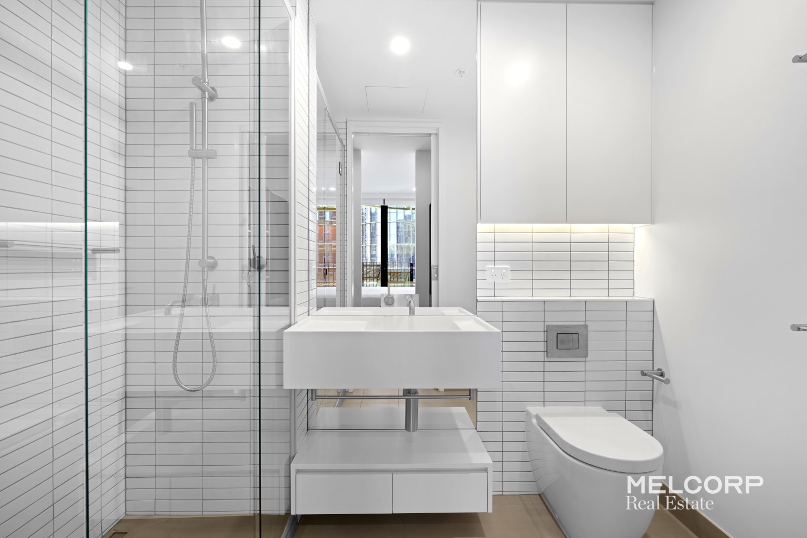 – Contemporary tiled bathroom with internal laundry provisions